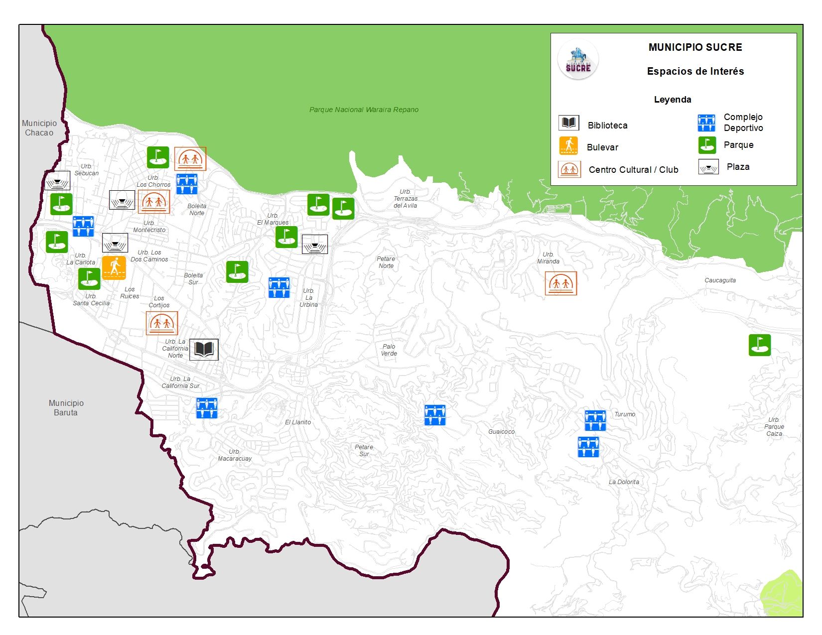 El municipio Sucre cuenta con equipamientos y espacios públicos que ofrecen una gama de actividades deportivas, recreativas y culturales de interés para los sucrenses y cualquier visitante del municipio.
