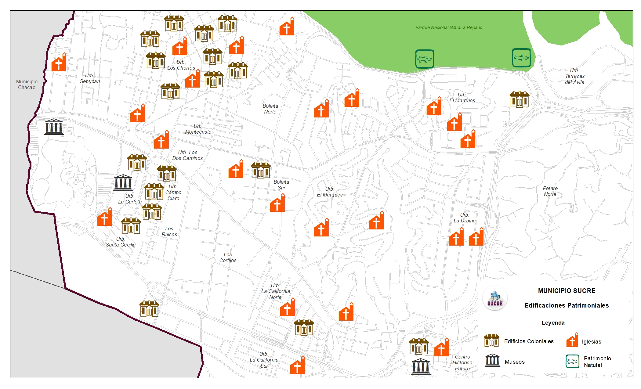 El municipio Sucre tiene alrededor de 107 edificaciones patrimoniales, localizadas entre las parroquias Leoncio Martínez y Petare (Figura 14). Existen otros elementos urbanos y naturales que también son incluidos en el catálogo patrimonial del municipio como son la Calle Z del Centro Histórico y la Plaza El Cristo, espacios públicos reconocidos por su valor cultural; y los petroglifos de La Julia y la quebrada Galindo ubicados en el Parque Nacional Waraira Repano, clasificados como patrimonio natural, entre otros elementos de interés.